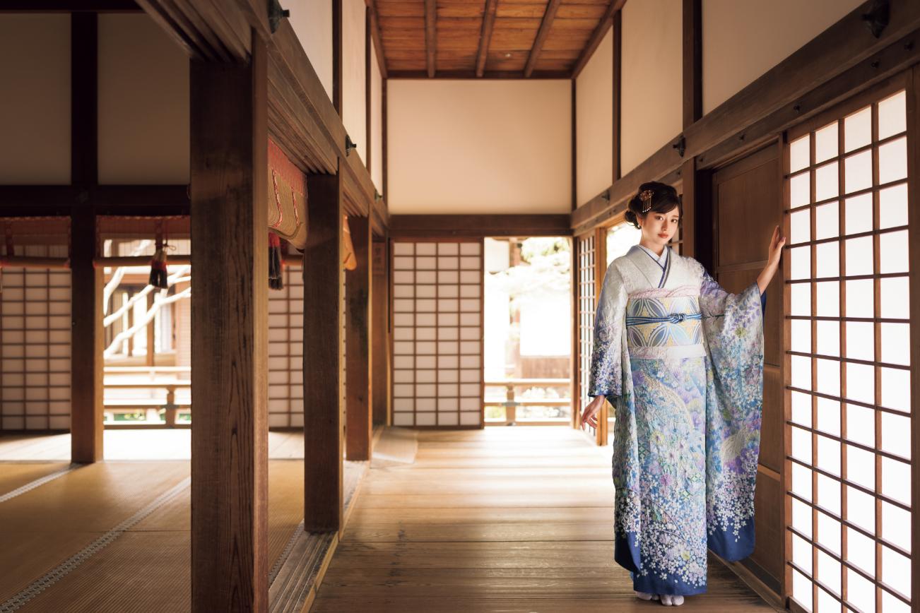 古典柄は柄が豪華な分、ヘアメイクはあえてシンプルにまとめると全体のバランスが良くなります。タイトなまとめ髪や、ドライフラワー、金箔アレンジなどとの相性も抜群です。