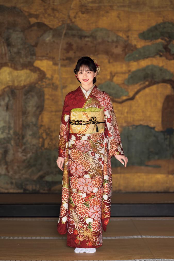 和のテイストを全面に押し出したデザインがかえって珍しく、オーラを纏った雰囲気ある着姿が目を引きます。