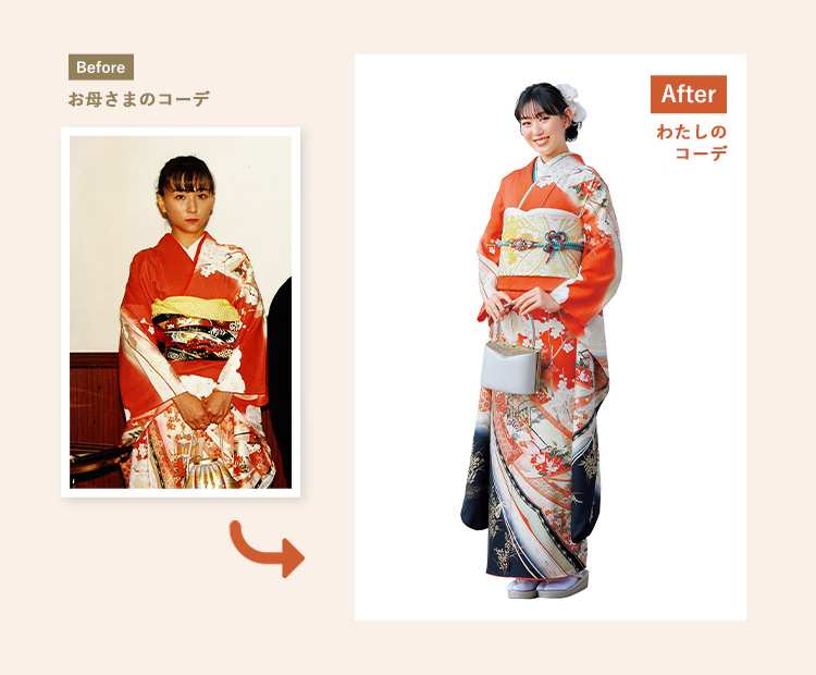 帯は色や柄が豊富なので、できれば新調をおすすめします。お母様の時は黒でゴージャス感を出していましたが、今回は優しい色と柄にチェンジ。レトロやスタイリッシュにも変身できます。帯は素材が進化し、長時間着けても疲れにくくなっています。長さも、華やかな飾り結びができる長さか確認しましょう。