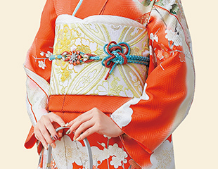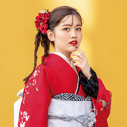 面積は小さくても、顔映りを左右する重要なアイテム。顔に近い半衿は肌が明るく見えるホワイト系か、レトロ感やモード感のあるブラックに挑戦しても。重ね衿は差し色になるので、振袖の色との対比を効かせ、さまざまな組み合わせを試して相性のよいものをセレクトしましょう。