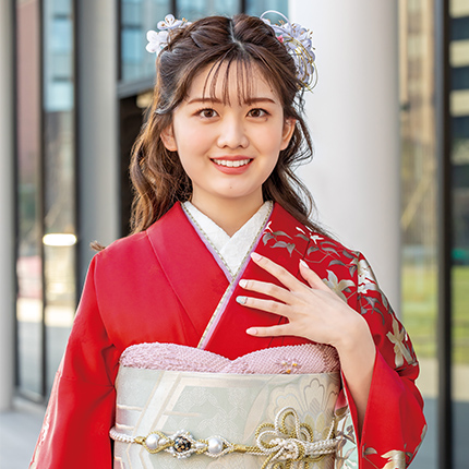 くすみがかったゴールドの帯は、レトロさやアンティーク感を出すのに最適。小物はピンクなどガーリーな色を選んで、振袖の華やかさとマッチさせて。