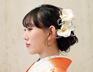 クラシカルな振袖におすすめのヘアスタイルは、エアリーなシニヨン。ランダムに巻いた髪を低めでふんわりまとめて、後れ毛でニュアンスを出しましょう。前髪はナチュラルにカールさせれば、たおやかで好印象。帯の色味と合わせた洋花で飾れば、今っぽくて洗練された大人ヘアに。